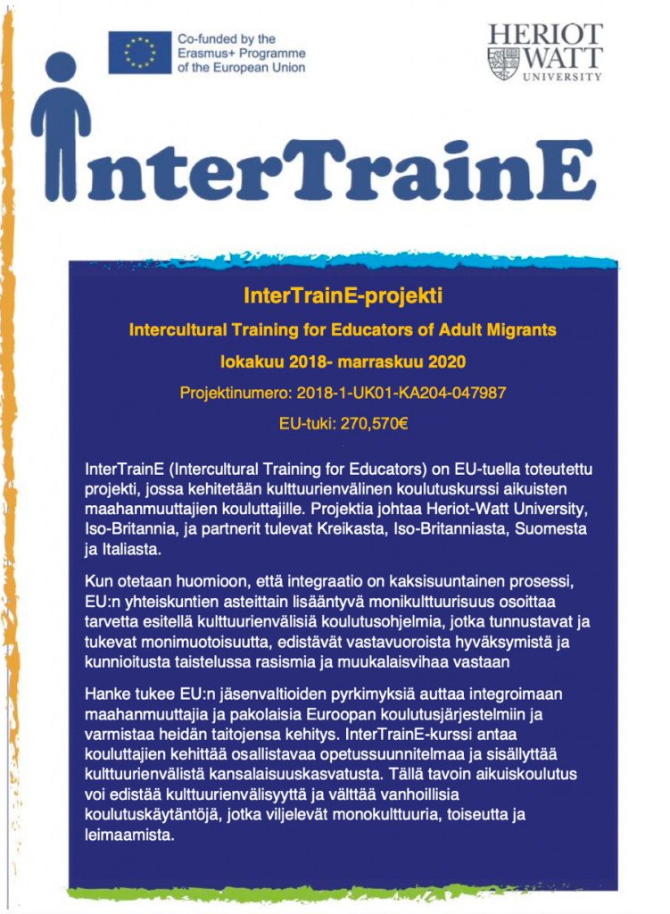 O1 ja O2: Kulttuurienvälisen koulutuksen tutkimusta; partnerit keräävät tietoa olemassa olevista koulutusohjelmista, jotka on suunniteltu maahanmuuttajien integraatiota varten sekä tarvetta uusien materiaalien kehittämiseen.